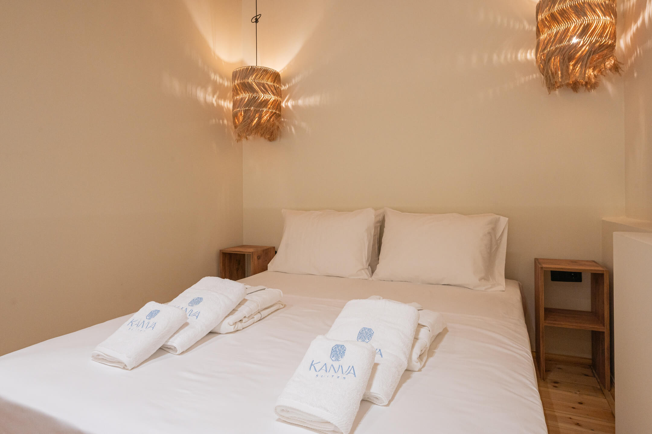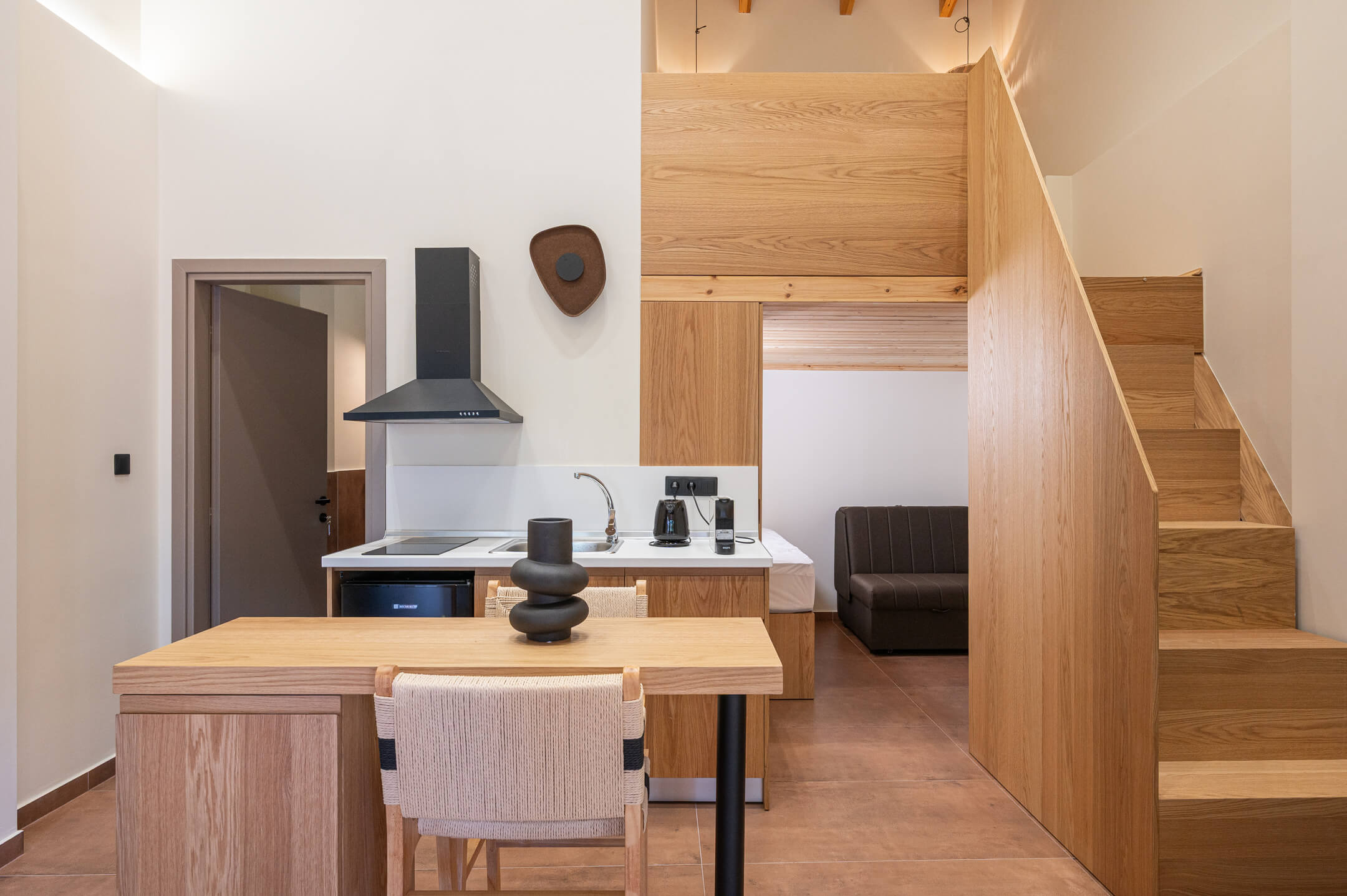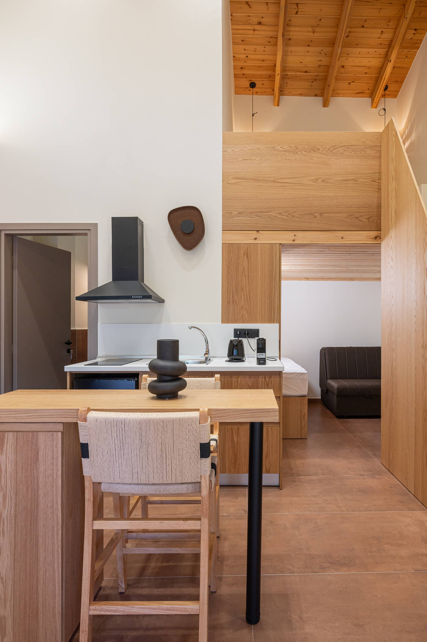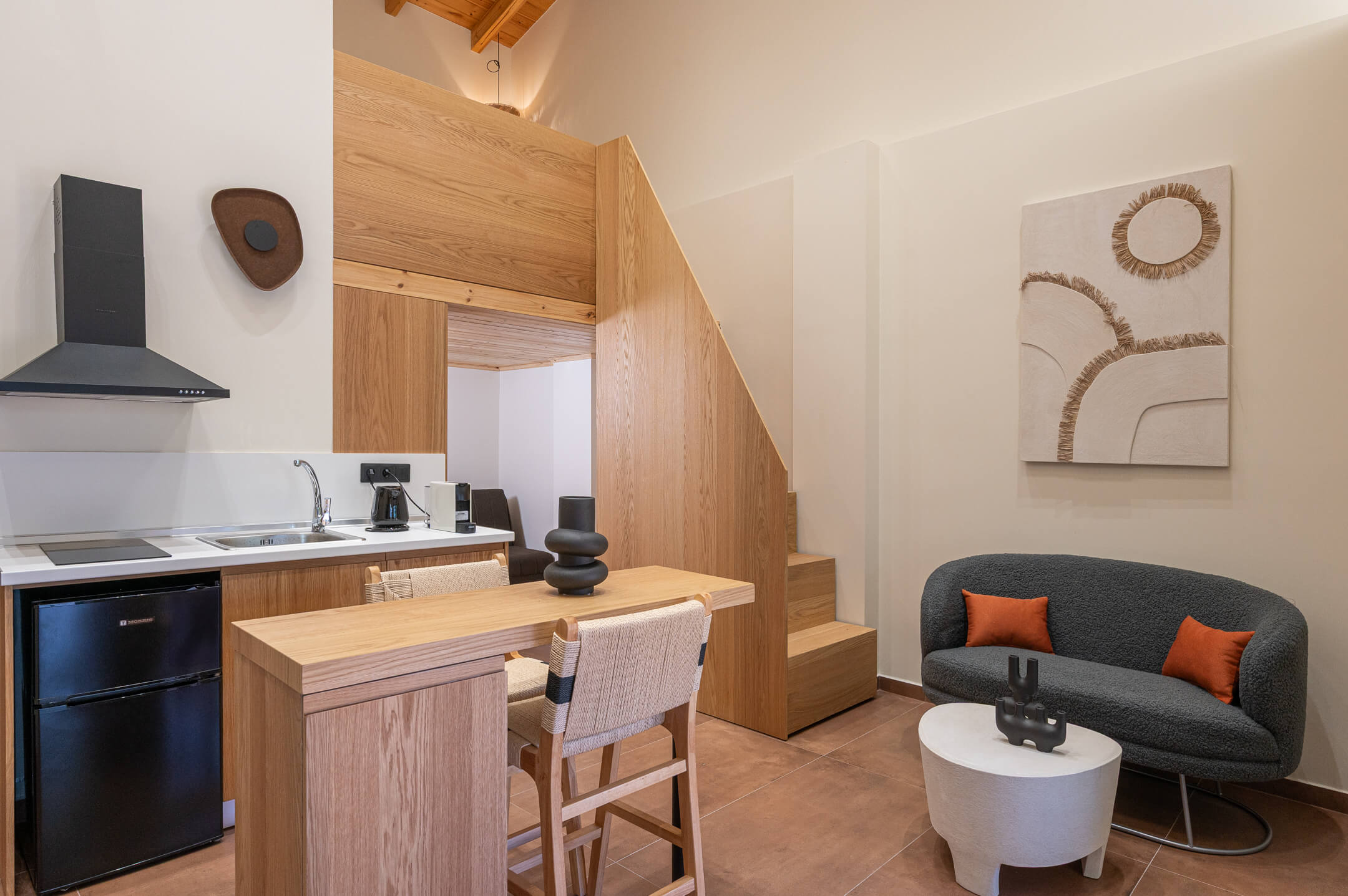 The bedroom is located on the upper floor of the house and features wooden accents and earthy tones that create a sense of coziness and simplicity.